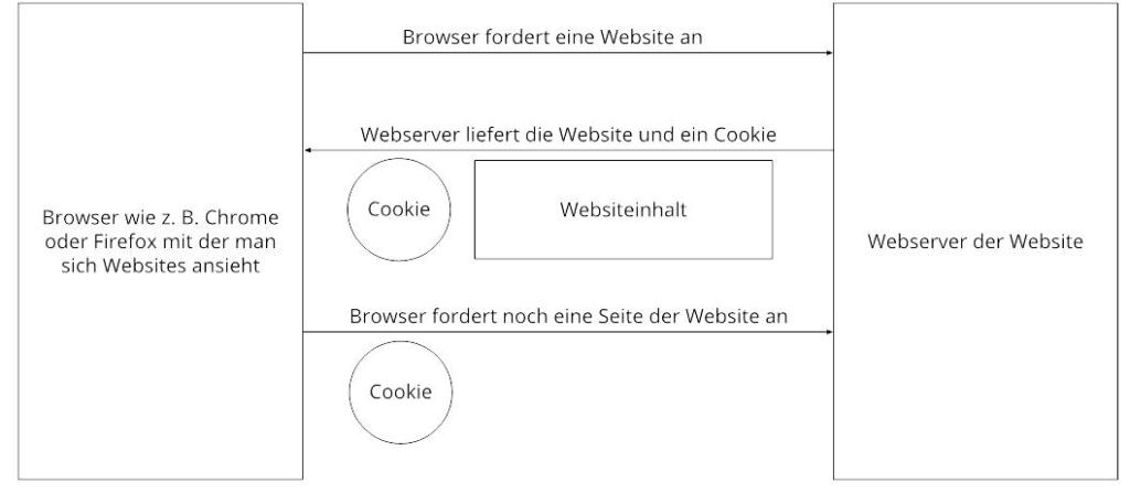 Die folgende Grafik zeigt eine mögliche Interaktion zwischen einem Webbrowser wie z. B. Chrome und dem Webserver. Dabei fordert der Webbrowser eine Website an und erhält vom Server ein Cookie zurück, welches der Browser erneut verwendet, sobald eine andere Seite angefordert wird.
